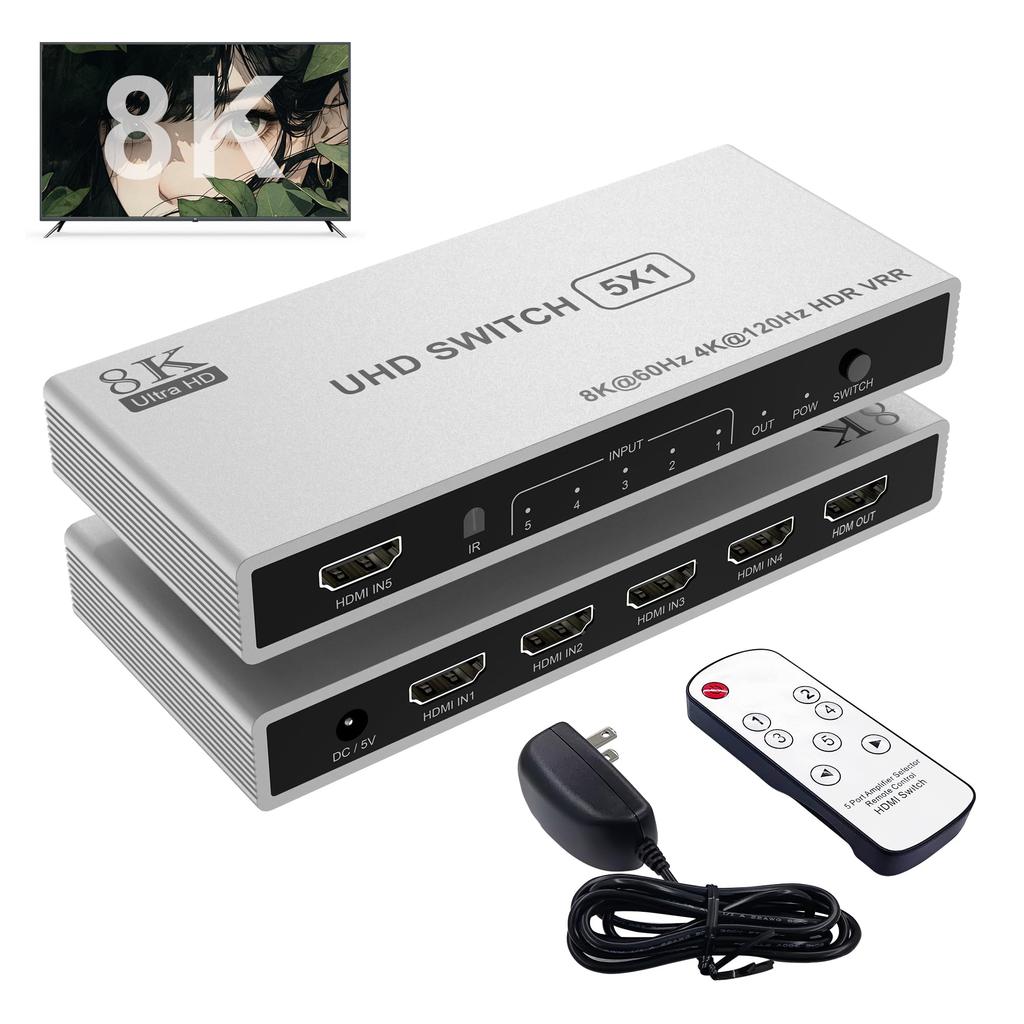8K60Hz/4K120Hz compatible, 5 inputs and 1 outputs HDMI switcher The 5 inputs and 1 outputs HDMI 2.1 switcher is the latest HDMI that supports HDCP 2.3, 8k@60Hz, 4k@120Hz, 1080P@240Hz Equipped with 2.1 chipset, it ensures better performance and easier switching experience when watching movies, TV, and games. Enjoy stunning audio and smooth picture quality with 4K UHD streaming up to 120fps, Dolby Vision, HDR, and HDR10+. Supports 48Gbps, VRR, 3D, Dynamic HDR, and Dolby Vision. Supports Dolby/HD/DTS HD/Dol by Atoms/Dolby AC3/DTS/LPCM and other audio formats. Connect 5 HDMI input source devices such as PS3/PS4/PS5, Xbox, Roku, Blu-ray player, DVD, laptop, Fire TV Stick; 1 HDMI output display device such as UHD 8K TV, monitor, projector, etc.