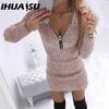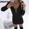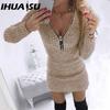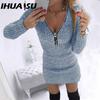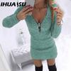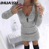 IHUASU S-5XL Autumn Winter Womens Wrap Skirts Zipper Waist Long Sleeve Knitted Dress Hips