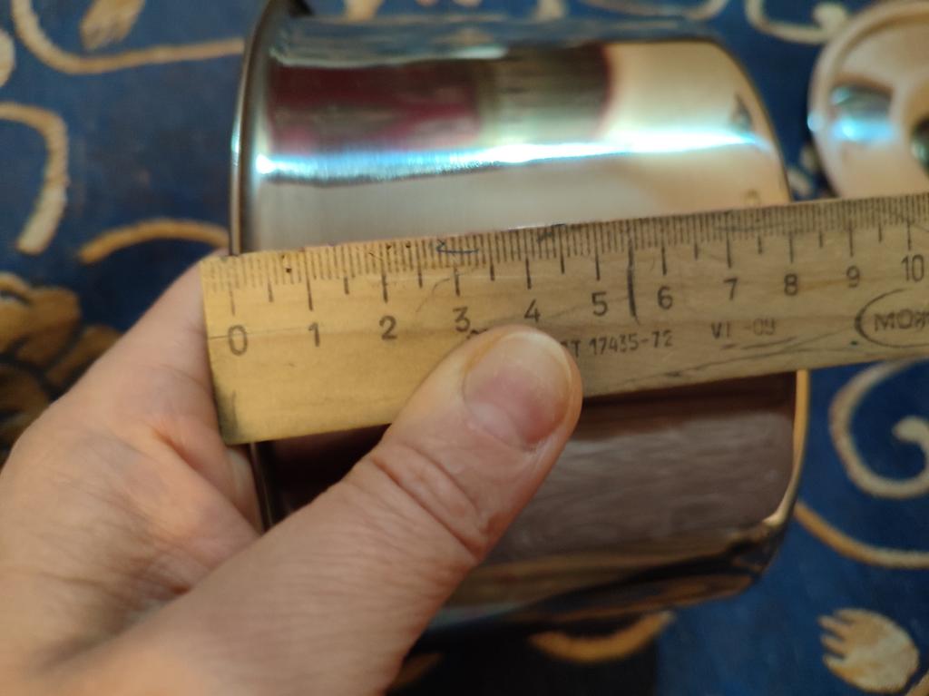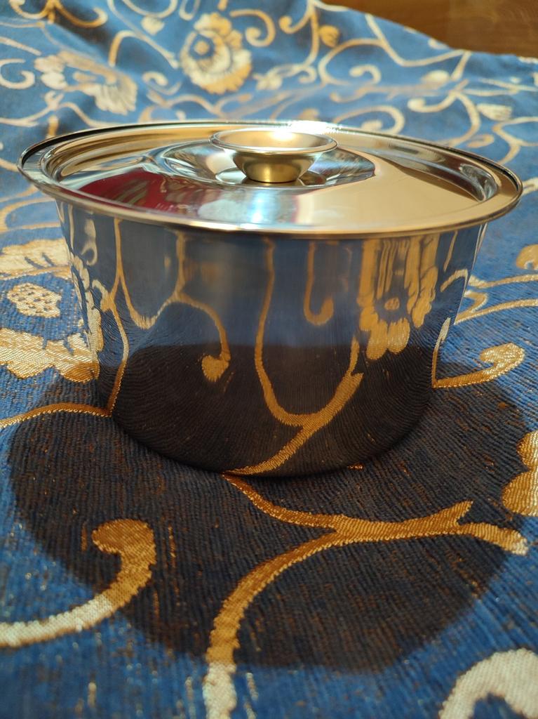 Good bowl without handles, with a lid. However, the metal is a bit thin. There are dents on the bottom.