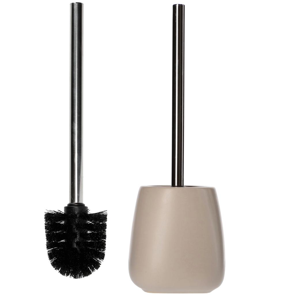 Modern, smooth toilet brush by KADAX from the Pastello bathroom line. The product looks modern, and its elegant, subtle shape will give the bathroom a unique atmosphere.. The product is interestingly designed and fits well into most bathroom arrangements. Made in such a way as not to take up much space, which makes it possible to place it without problems even in a tight corner. Stable construction enables safe and comfortable use and keeping the toilet clean. The toilet brush is an essential item for every bathroom or toilet, which cannot be forgotten when furnishing the interior. Excellent for daily and frequent use. The product is smooth, and its oval shape will add aesthetic value to the bathroom, which is not without significance when designing a modern interior. The brush combines elegance and practicality, and these two functions perfectly complement each other. Useful for effective and thorough cleaning of the toilet. The oval shape of the product allows it to be used both in a large, spacious bathroom and a small toilet.. Its light weight makes it extremely comfortable to use, and carrying it around poses no problems.. Besides, it will perfectly fit into the bathroom arrangement together with other essential products from the series – a soap dispenser, a soap dish, and a bathroom cup, creating an attractively looking whole and making the room gain functionality.. The article, due to its size, perfectly adapts to the requirements of a modern bathroom.. Despite its considerable size, the product, with a width of 11.5 cm and a height including the handle of 34 cm, does not take up much space.. The brush is made of ceramic, and the handle part is made of steel, which gives it stability and ensures safety in use.. The color scheme is subdued and universal, and the materials used are of good quality.. The interestingly designed handle holds stably to the base, which ensures efficient use.. The brush is available in five colors: white, beige, brown, grey and turquoise, so everyone who enthusiastically approaches attractive and functional bathroom equipment will find something suitable for themselves. The brush fits very well in the hand, does not slip from the fingers, and does not cause problems during use, which is further guaranteed by its plastic end.. Its stable construction will ensure long-term use.