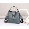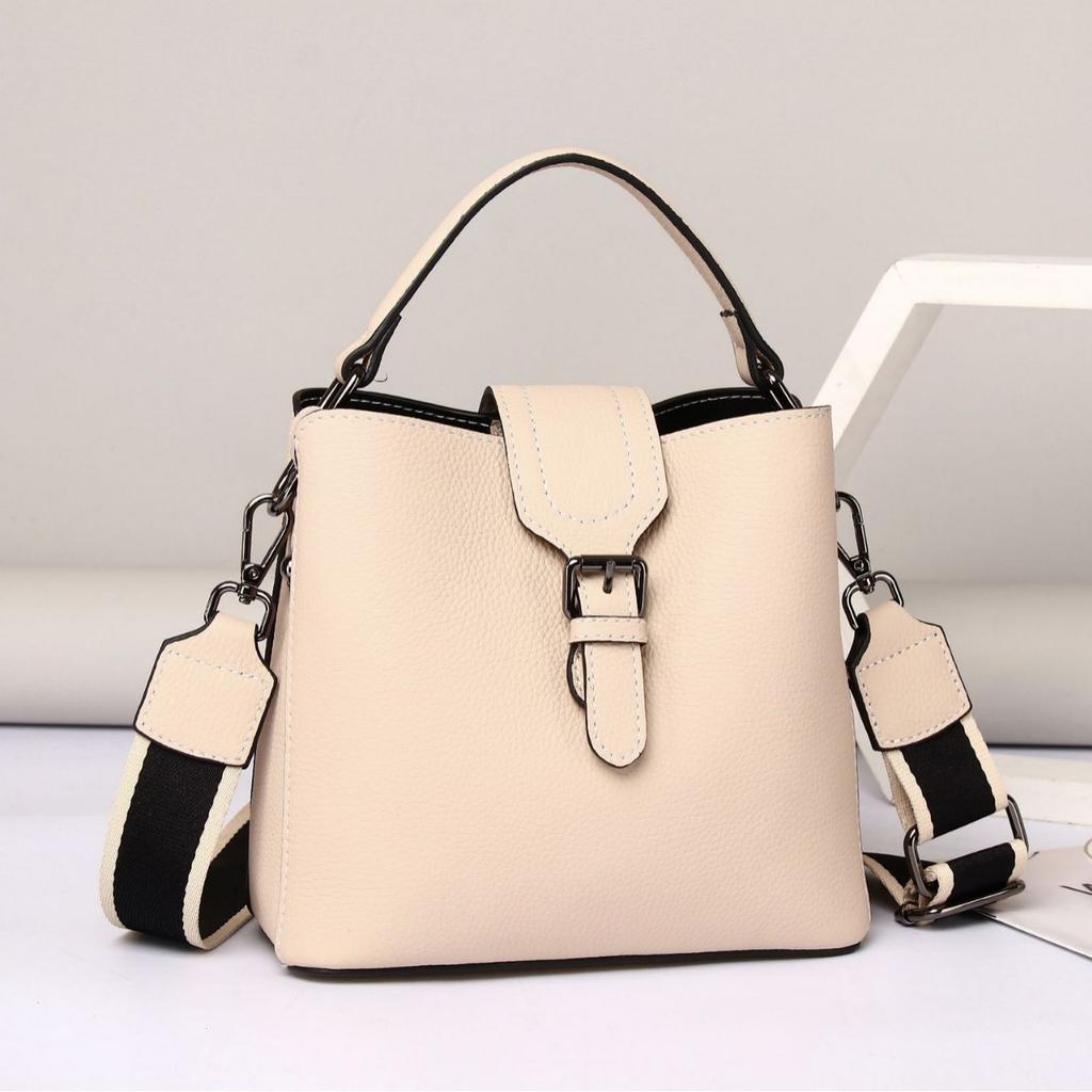 - These bucket - style handbags feature a trendy and elegant design. Crafted from leather, they have a smooth and luxurious texture. Available in six sophisticated colors, each bag showcases a structured silhouette with a top handle and a flap secured by a metallic buckle. The contrasting stitching details add to their stylish appeal.