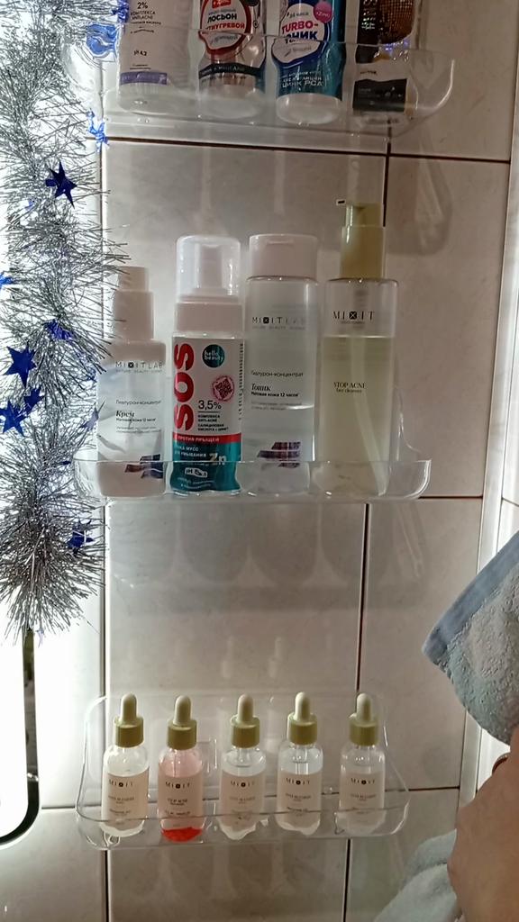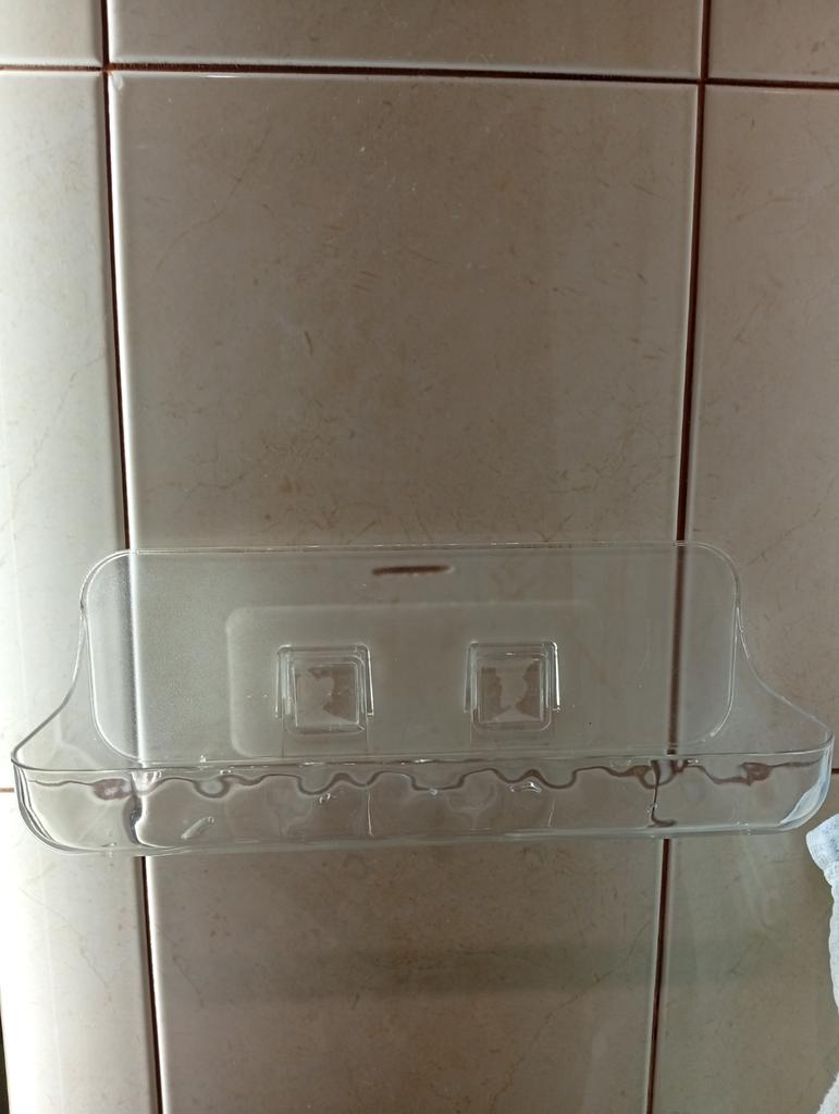 The shelf fits well in the shower cabin. We'll see how strong the attachment is later.