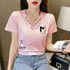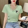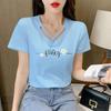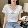 Elevate your wardrobe with this chic women's V-neck T-shirt, designed in a modern Korean style. Crafted from high-quality polyester, this short-sleeve top offers a comfortable and breathable fit. The solid color design is complemented by subtle letter decorations, adding a touch of uniqueness to this versatile piece. Perfect for any casual occasion, this T-shirt pairs effortlessly with your favorite jeans or skirts for a stylish, everyday look.