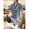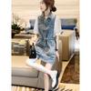 Summer Women Denim Dress Slim Fit Tie Waist V Neck Straight Cut Fashion European Style