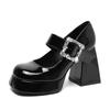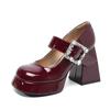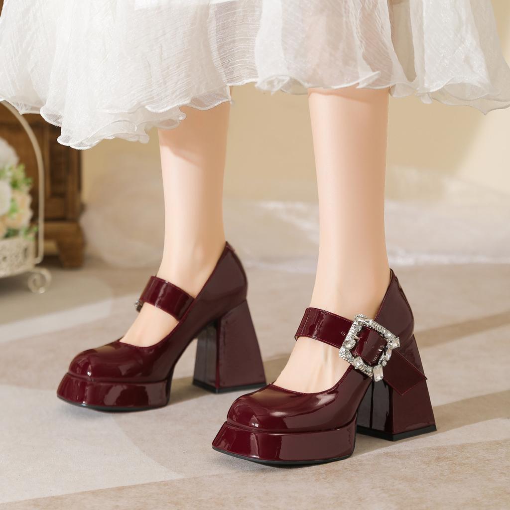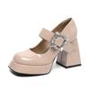 Round Head New Patent Leather Rhinestone with Thick High Heels Waterproof Table Mary Jane Single Shoes Women's Versatile