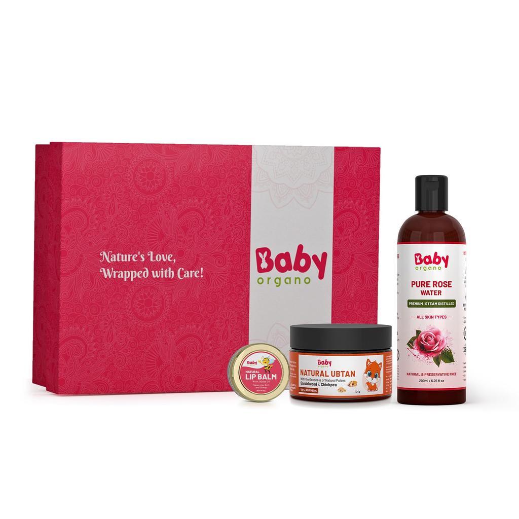 BabyOrgano Gift Set - Soft Petals Ayutvrdic Care for Kids | Natural Ubtan - 100mg | Pure Rose Water - 200ml | Lip Balm - 8gm