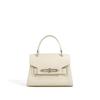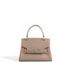 This bag has a stylish, trapezoidal silhouette crafted from cowhide leather. It features a textured surface, a metal clasp decoration, a top handle, and an adjustable shoulder strap. The design gives it a classic, elegant look.