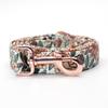 it made by hand with high quality rose gold metal buckle, it is quick release buckle so they are easy to get on and off . Silver D-ring leash attachment .
