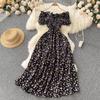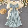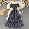 French Retro Floral Slimming High-Waist Long Dress with Pleated Drawstring and Big Swing Hem