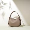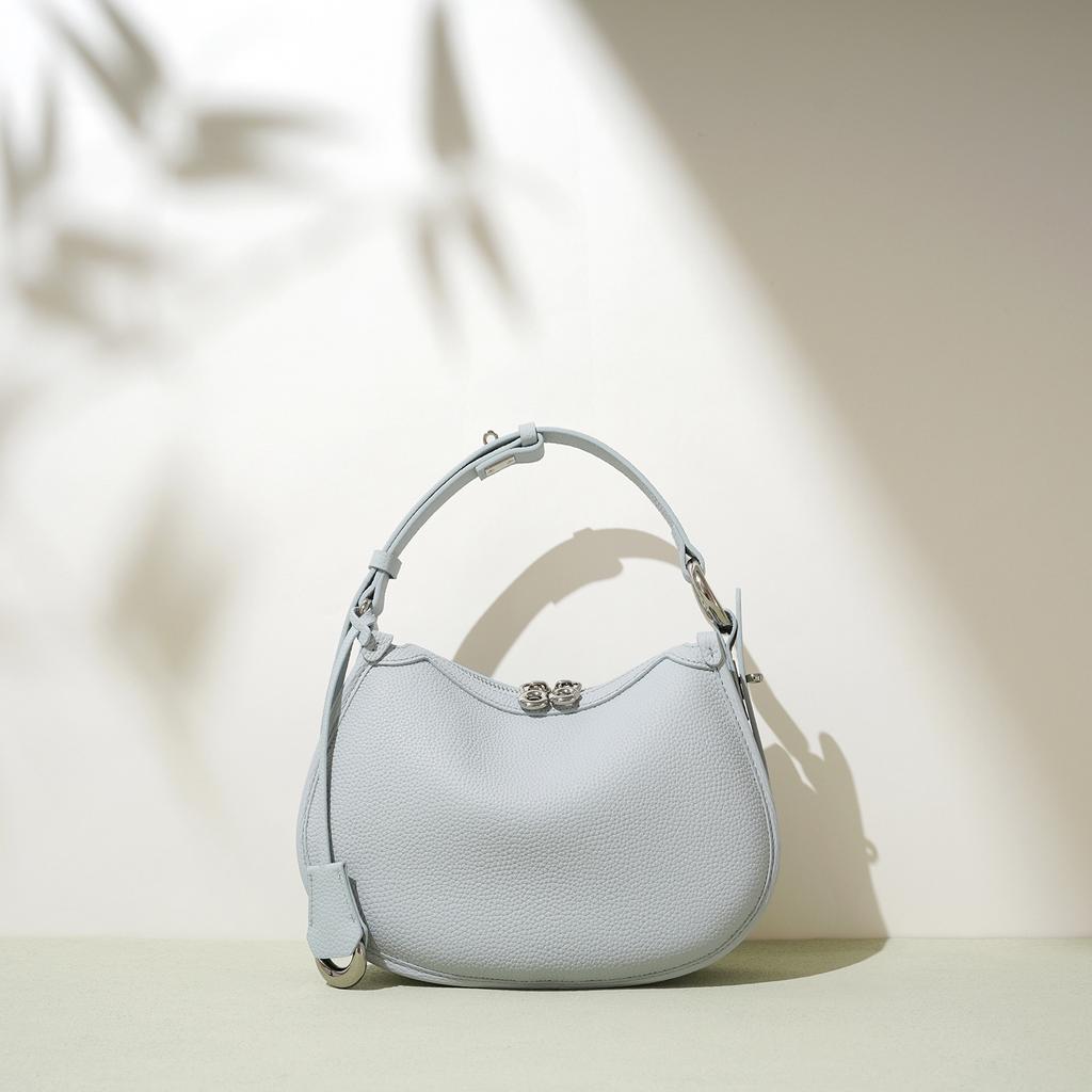 This bag has a chic, curved silhouette crafted from top - grain cowhide leather. It features a soft, pebbled texture, a decorative lock at the bag opening, and a minimalist design. The elegant and stylish look makes it a standout accessory.