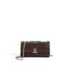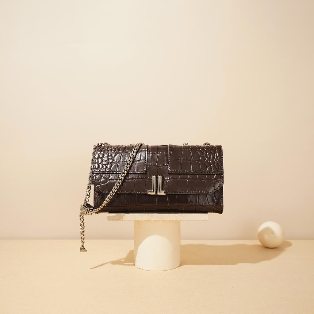 This bag has a stylish, crocodile - embossed silhouette crafted from cowhide leather. It features a metal chain shoulder strap, a unique metal lock design, and a compact rectangular shape, creating a fashionable and elegant look.