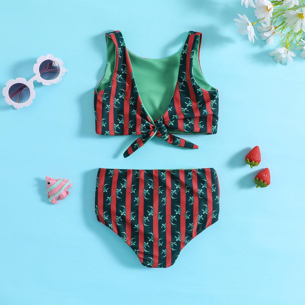 This vibrant 2-piece bikini swimsuit set is perfect for young girls looking to make a splash in style. Crafted from high-quality polyester, the swimsuit offers a comfortable and flexible fit, ensuring ease of movement during any water activity. The standout feature is its reversible design, allowing for versatile wear with different floral prints on each side. This fun and functional swimsuit set is ideal for beach outings, pool parties, and backyard play.