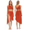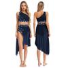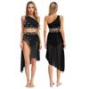Womens Lyrical Modern Dance Outfits Dancewear One Shoulder Ruched Mesh Overlay Rhinestones Crop Top with Irregular Hem Skirt