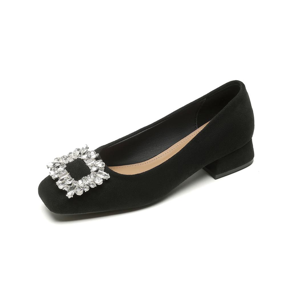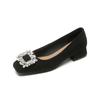 Square Head Single Shoes Women's Thick Heel Black Work Shoes Rhinestone Shallow Mouth High Heels Women