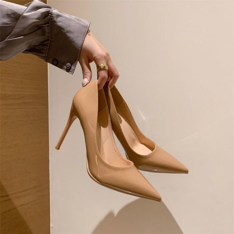 Patent Leather Pointed Toe Nude High Heels Femininity Socialite Year New Professional Black Thin Heels Not Tired Feet Shoes