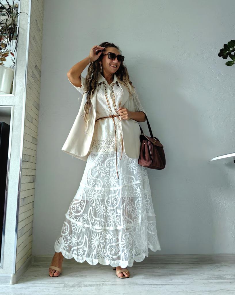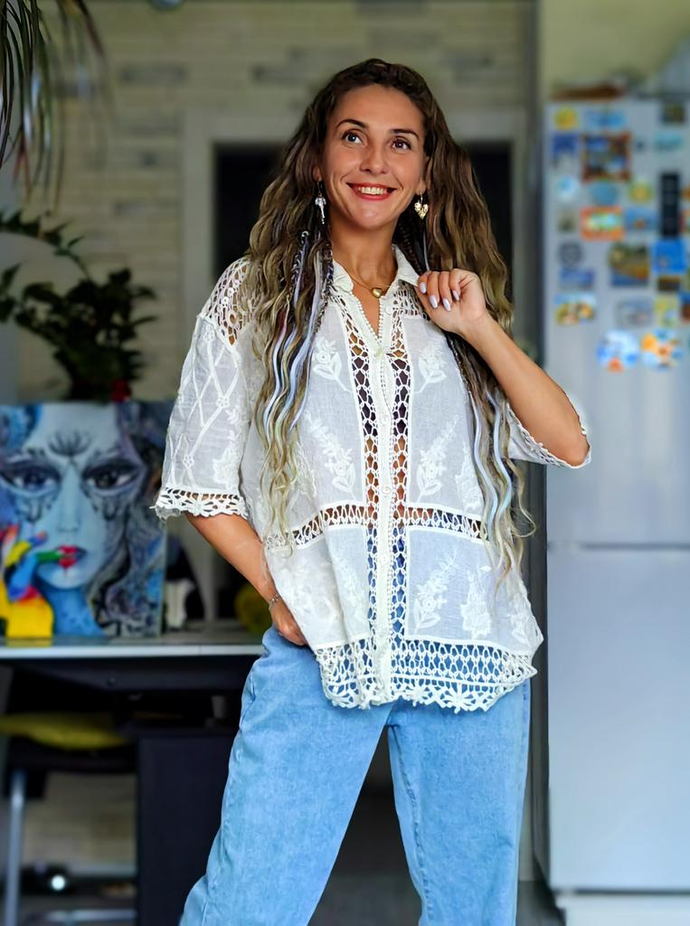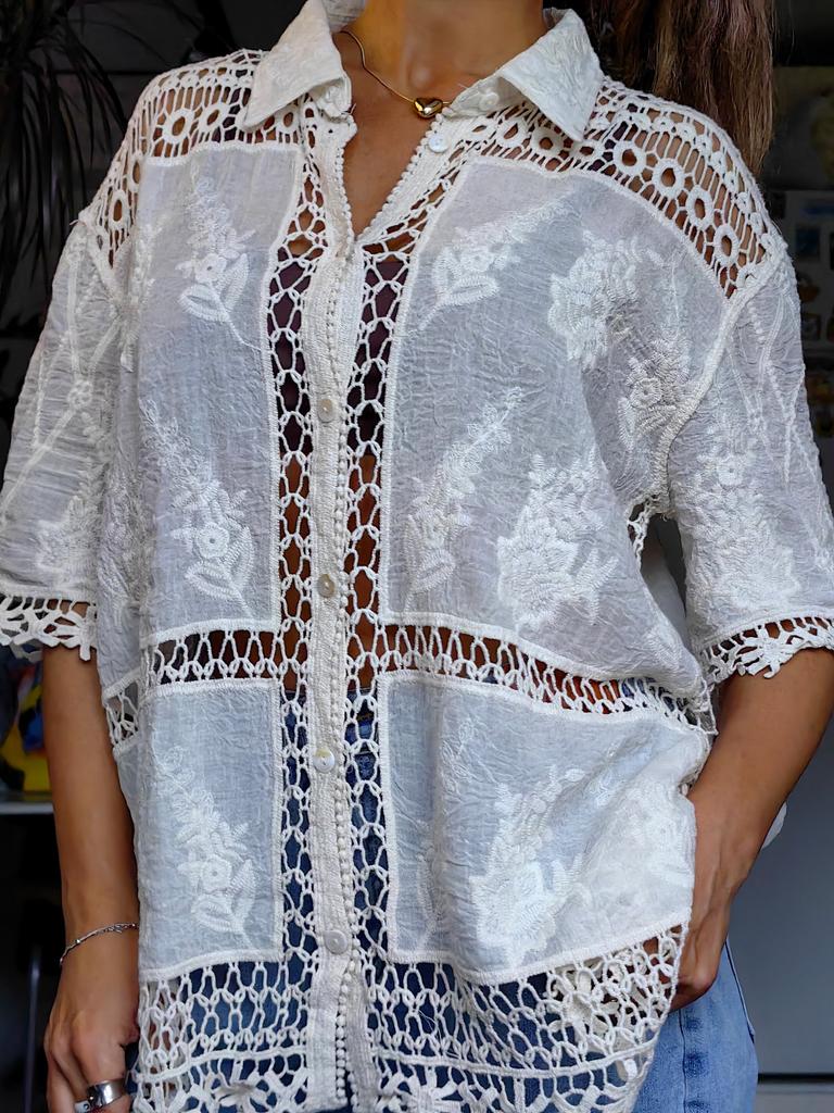 DIMANAF 2025 New Summer Buttons Shirt Women Lace Blouse Embroidery Short Sleeve Fashion Tops Tees Casual Loose Tees