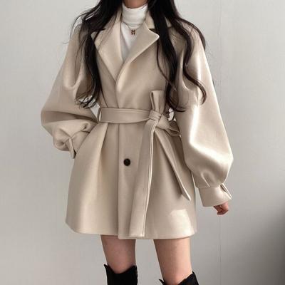 Women's Hong Kong Style Autumn and Winter Clothes Vintage Suits, Collar Ties, Waist Cinching, Balloon Sleeves, Small Woolen Jacket