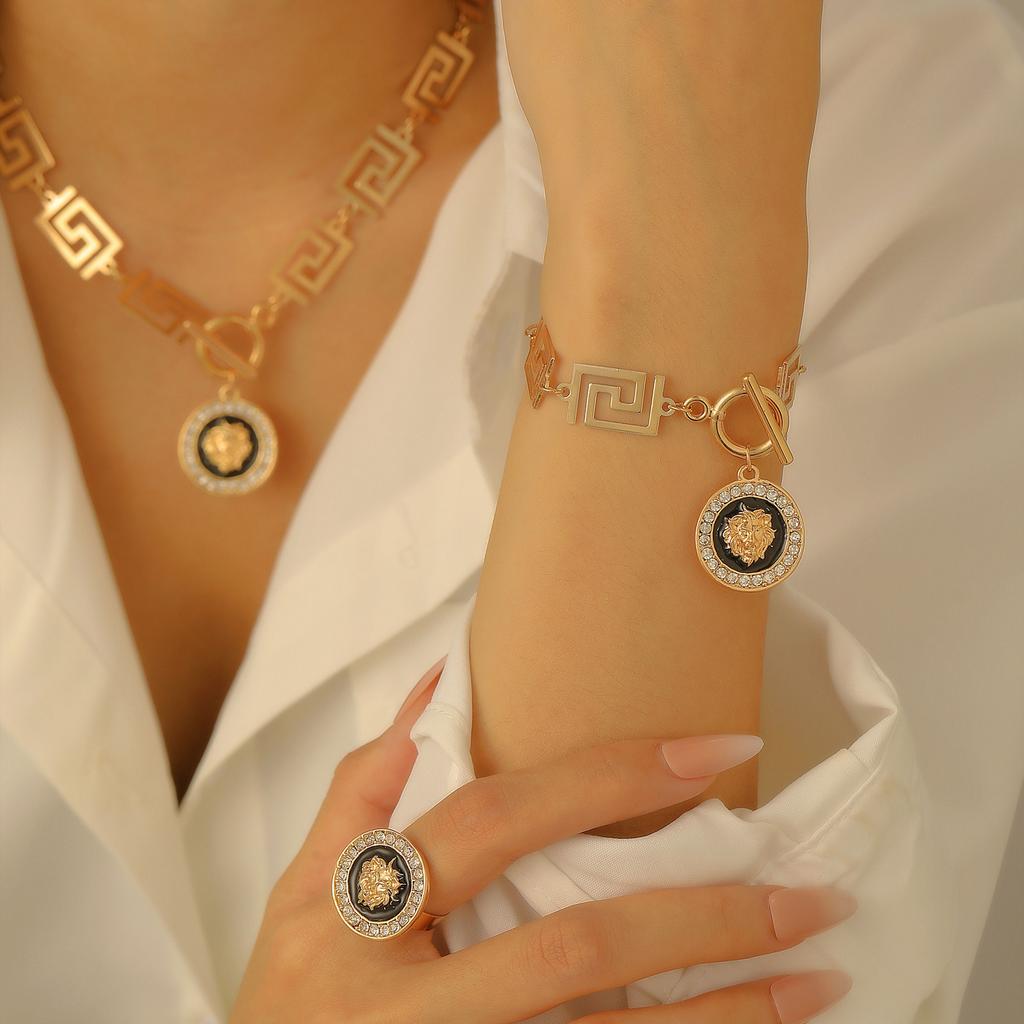 Gold Jewelry Set For Women, Necklaces Bracelet And Earrings With Cubic Zirconia Lion Pendant Luxurious Metallic Style Gift