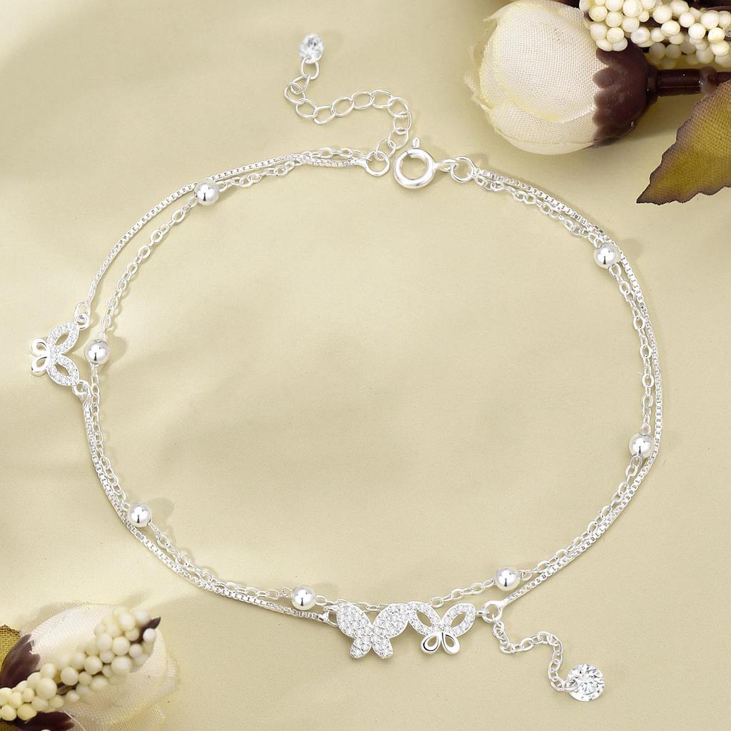 Korean Fashion Double Layer Butterfly Tassel Anklet - Versatile 925 Silver Women's Style