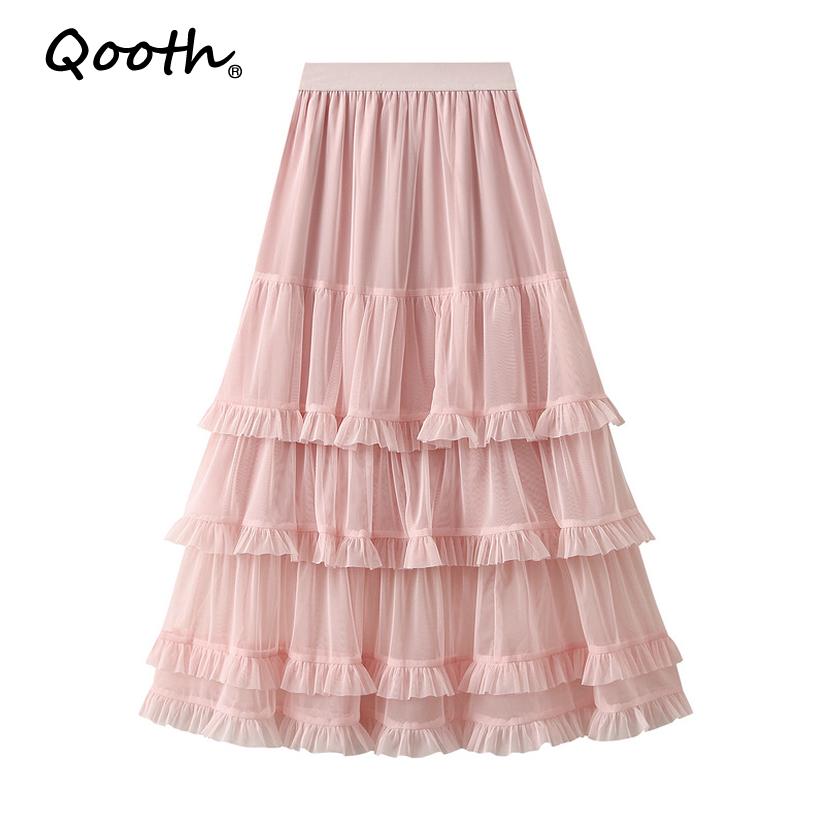 Qooth Sweet Tiered Tulle Skirt Summer Pink A Line Skirt Simple Casual Trendy Women's Skirt QT2591