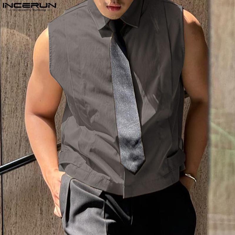 INCERUN Men Lapel Neck Sleeveless Solid Lace-up Casual Shirts Tank Tops