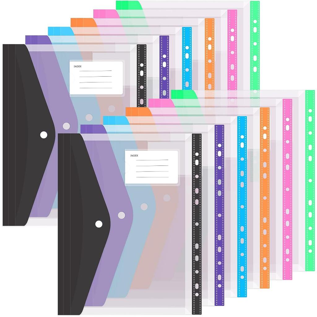 12pcs A4 Binder Pocket Plastic Envelopes Binder Folders, 11 Holes Expandable Binder Folders Document Pouch with Snap Button & Label Loose-Leaf