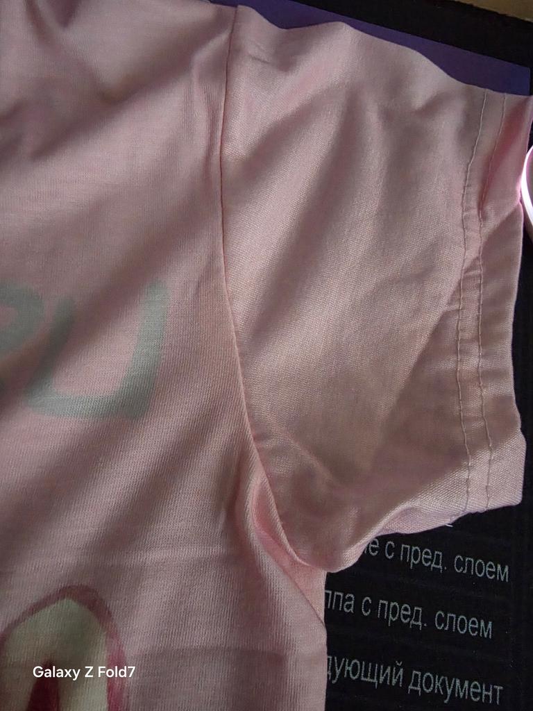 Synthetic, not thin, hot for summer. The pattern is not a sticker, does not fade, looks nice. The tailoring is so-so, the neckline sticks out. The overall impression is 4 out of five, so that's how many stars too.