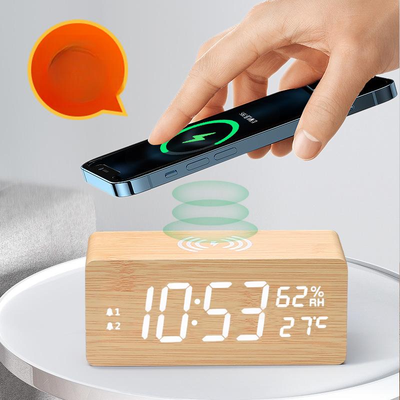 Multifunctional Fast Charging Wood Temperature and Humidity Wireless Charging Perpetual Calendar Clock Sleep Alarm Clock Creative Electronic Clock