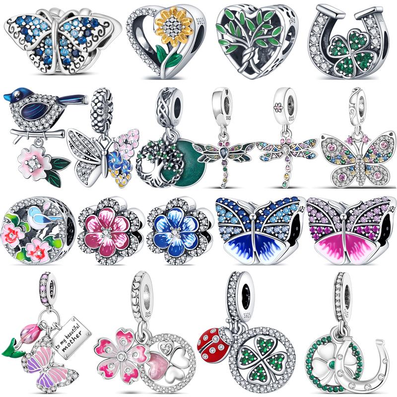 925 Copper Dragonfly Butterfly Flowers Ladybug Four Leaf Clover Tree Love Spring Beads Fit Pantaro Charms Bracelet DIY Zircon