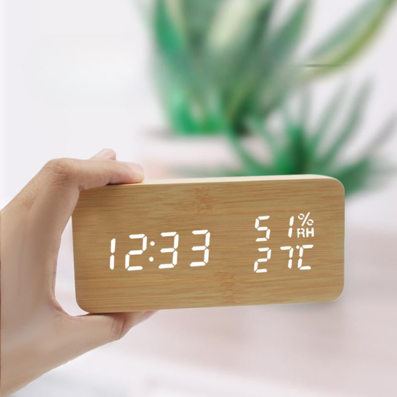 Rectangular Home Bedroom Electronic Temperature and Humidity Alarm Clock USB Voice Control LED Brightness Adjustment Digital Wood Clock