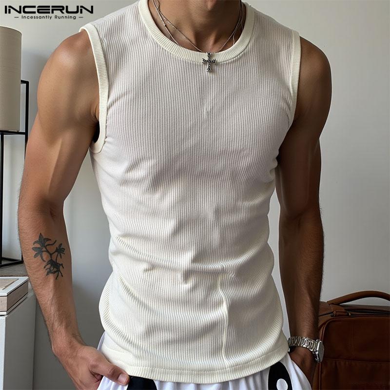 INCERUN Summer Men Round Neck Sleeveless Semi-Sheer Rib Casual Tank Tops