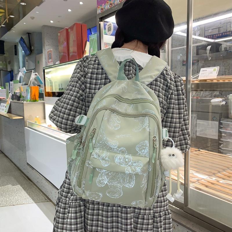 School Bag for Female Junior High School Students, Simple and Versatile Printed Bear Backpack, Niche Design, Light Backpack for High School Students