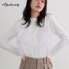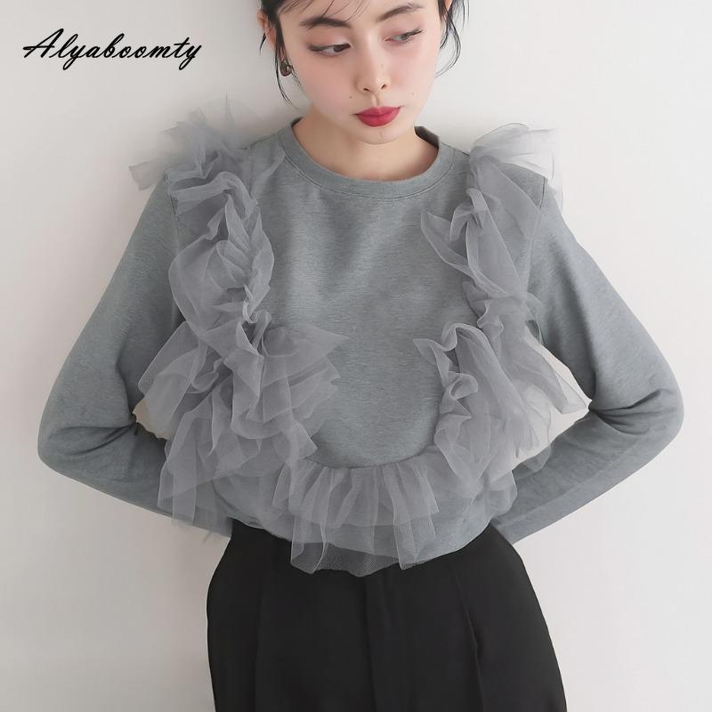 Korean Ulzzang Spring Autumn Women Streetwear Top O Neck White Gray Black Ruffles Patchwork T-Shirt Stylish Feminine Ladies' Tee