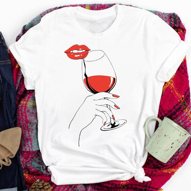 Red Lips Drinking Red Wine Women Printed Short Sleeve Casual Cartoon Fashion Clothes Print Tee Top Tshirt Female Graphic T-Shirt