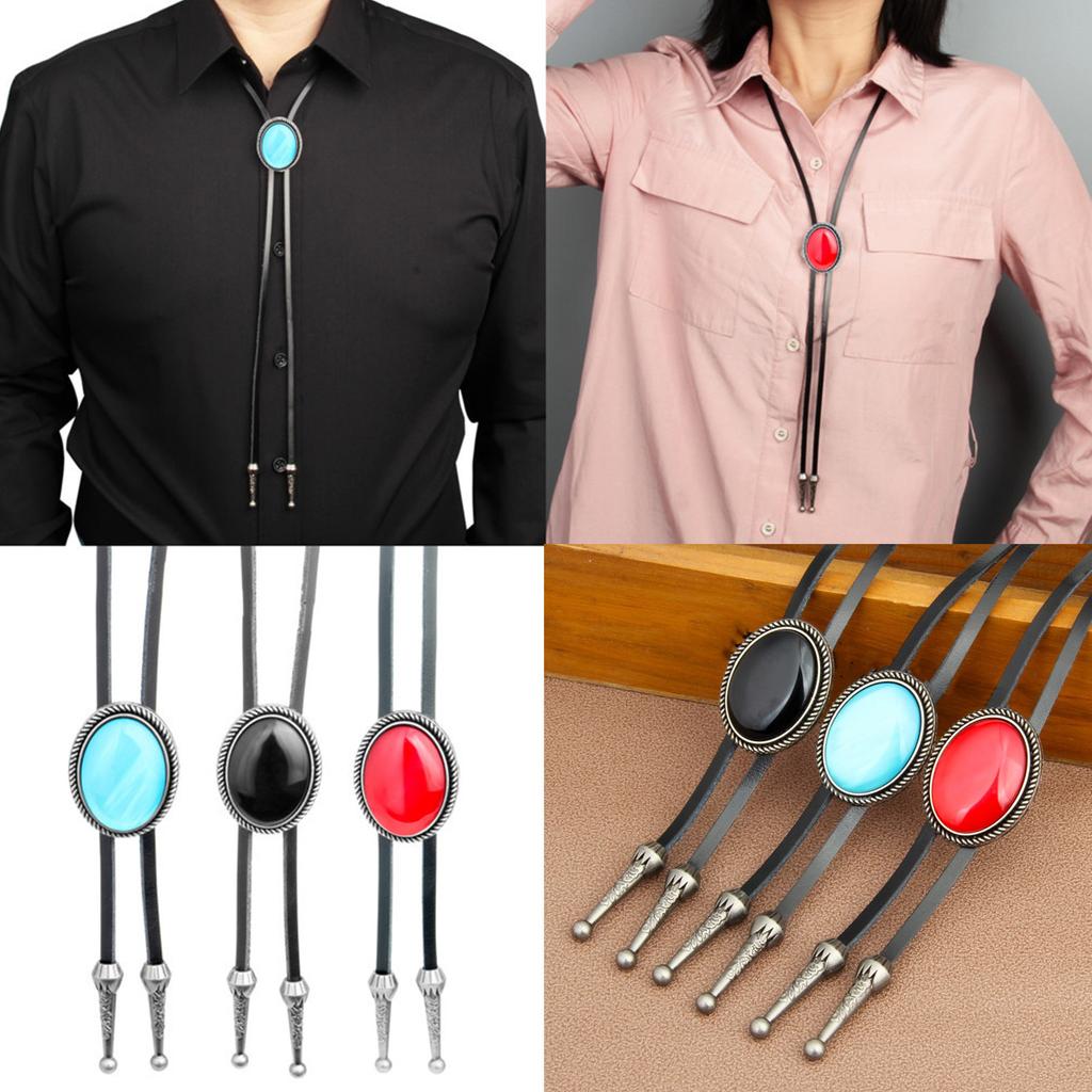 Unisex Vintage Oval Shape Stone Pendant Bolo Tie Western Faux Leather Rope Necktie Jewelry Shirt Collar Chain Necklace