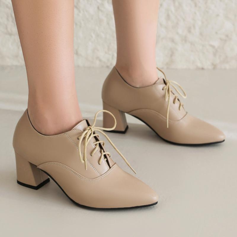 Elegant Women's Low Heels Loafer Shoes Fashion Lace-up Black Khaki Nude Short Heeled Party Wedding Office Shoes Female Big Size
