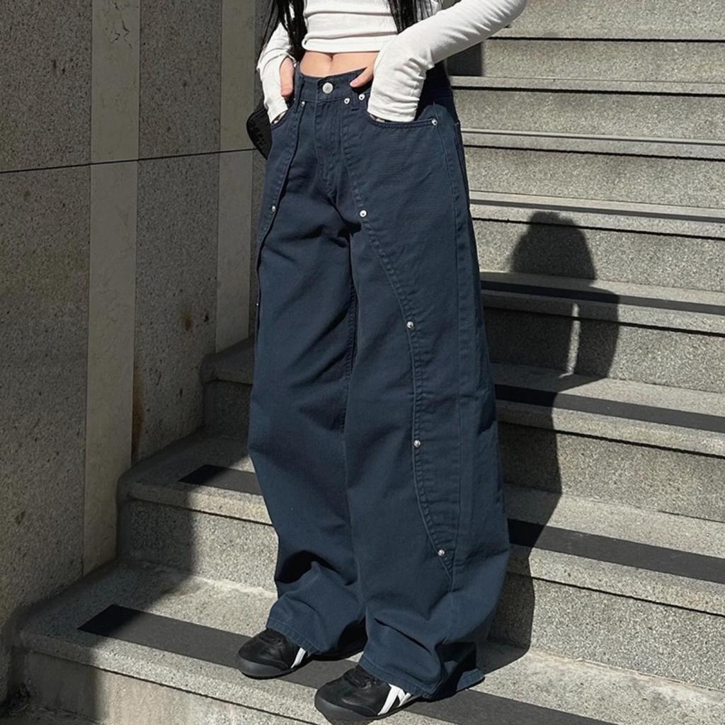 Casual Loose Rivet Jeans Wide Leg Pants Basic Low-Waisted Straight Pants Women Streetwear