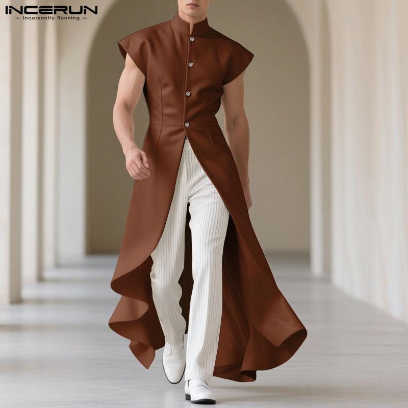 INCERUN Men Stand Neck Sleeveless Splits Irregular Casual Pleated Long Waistcoats