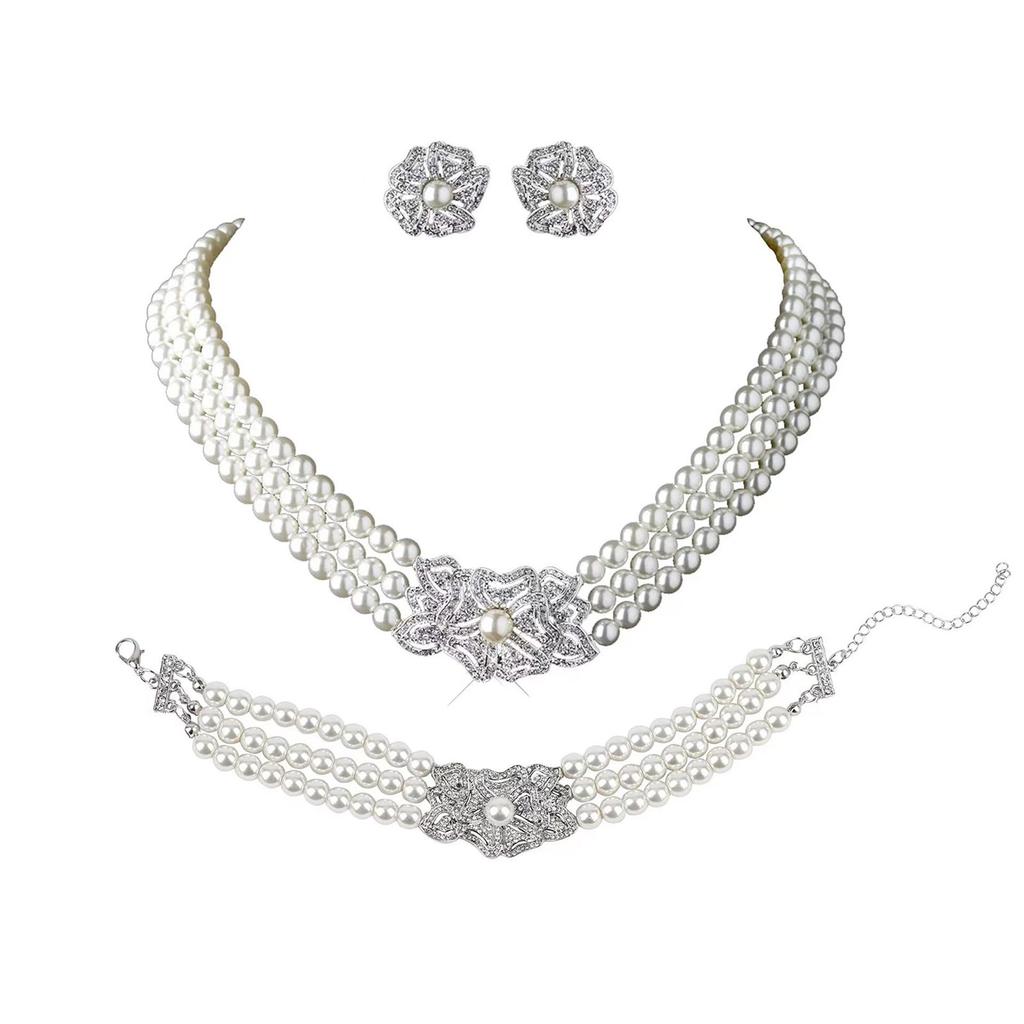 Victorian Style Necklace Earrings Bracelet Set Featuring Simulated Pearls and Cubic Zirconia for Elegant Occasions