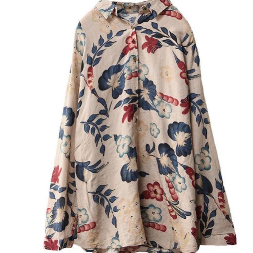 Large Size Loose Literary Retro Floral Cotton and Linen Shirt All-match Long Top