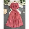 Spring and Autumn New Arrival French Style Retro Round Neck Short Sleeves Chiffon Dress Women's Tight Waist Slim Looking Elegant Pleated Midi Dress