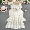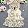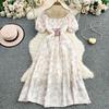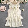 French Style Retro Butterfly Print Square Collar Puff Sleeve Dress Women Summer Lace-up Waist Hugging Slimming Big Hemline Long Dress