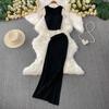Knitted U-Neck Sexy Short Sleeveless With Chest Pad Vest Top + High Waist Slimming Split Skirt Two-piece Suit