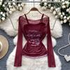 Stylish Bandage Dress Two-piece Set Women's Fashion off-the-Shoulder Long Sleeves Thin Print Mesh T-shirt + Bottoming Shirt Camisole