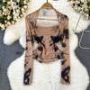 Long Sleeve Square-Neck Tie Dye Mesh Sunscreen Slim Fit Fake Two-Piece