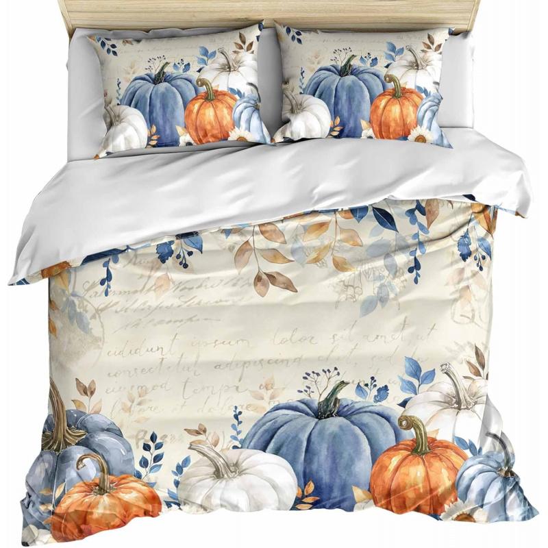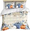 Fall Blue Pumpkins Duvet Cover Set 3 Pieces, Thanksgiving Orange Gray Botanical Rustic Bedding Sets