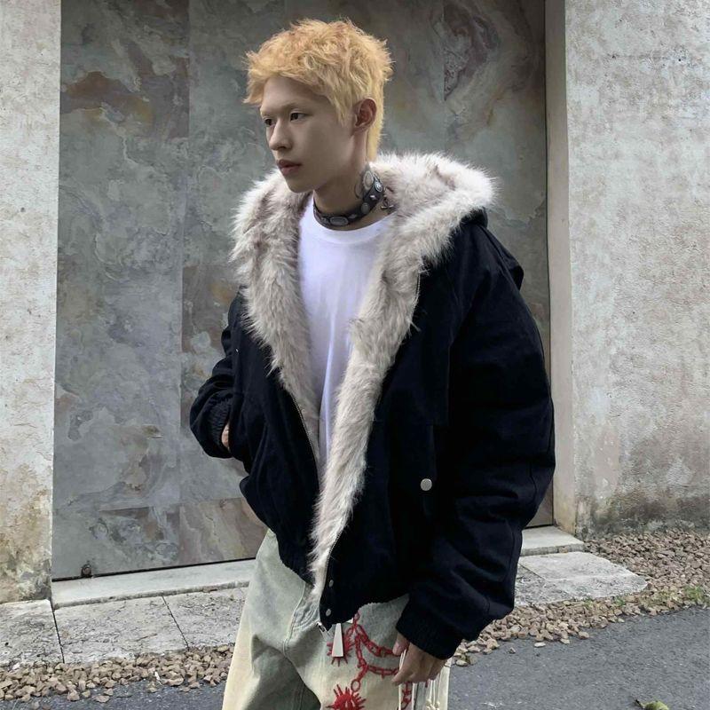 American Retro Woolen Collar Hooded Cotton Jacket Winter Thick Plush Top Men Street Hip-Hop Gothic Harajuku Oversize Jacket Coat