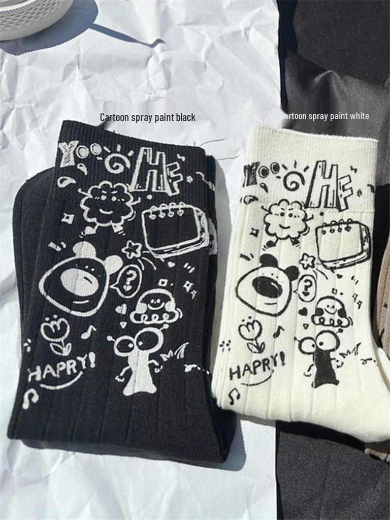 Trendy Mid-Calf Black & White Graffiti Skateboard Socks with Hot-Stamped Cartoon Style Letters