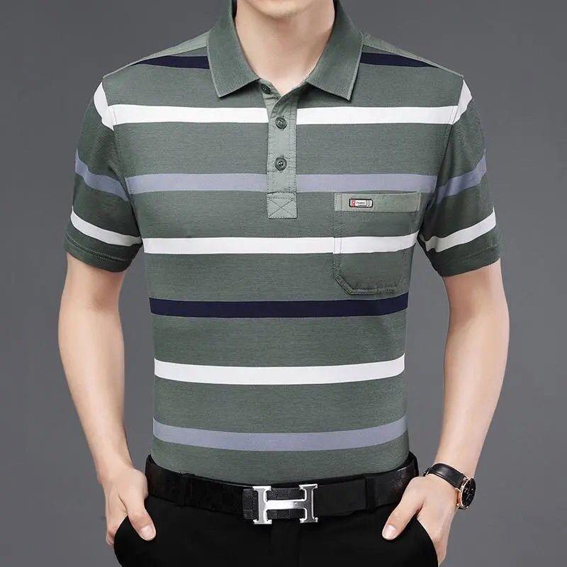 Casual Male Clothes Cotton Short Sleeve Stripe Polo Shirts Summer New Pocket Business Streetwear Fashion Men Versatile Loose Top