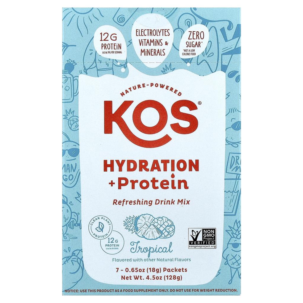 Product Description: 12g of protein per serving (10% Daily Value) Electrolytes Vitamins & Minerals Sugar-Free* Naturally Sourced Ingredients Clean Plant-Based Protein Non-GMO Project Certified Contains Other Natural Flavors Did you know that 60% of the human body is made up of water and 14-16% of total protein? KOS® Hydration + Protein hydrates and lifts your mood. This is the protein that energizes you. Hydration Over 1,000mg of Electrolytes 400mg of Potassium 400mg of Chloride 300mg of Sodium 5mg of Magnesium Muscle Recovery + Excellent Source of Protein 12g of Energy Per Serving Contains Vitamins B6 and B12 Our sustainably sourced UpCycled Certified™ protein is made from barley, the same grain used to make rice. Good for you. Good for the planet. KOS® Tropical Hydration + Protein, packed with a variety of ingredients, delivers a vibrant taste reminiscent of a sun-drenched paradise. Juicy pineapple and sweet mango will tantalize your taste buds while you're lounging on the beach. Hydration + Protein. Shake. Get 1,000mg of an optimized blend of electrolytes, essential vitamins, and minerals, plus 12g of transparent plant-based protein. Enjoy it first thing in the morning, at (or during) your workout, or anytime you need a thirst-quenching protein boost. Contains up to 7 servings per week, but you won't find it lacking. *Not a low-calorie food. As part of your daily protein intake.